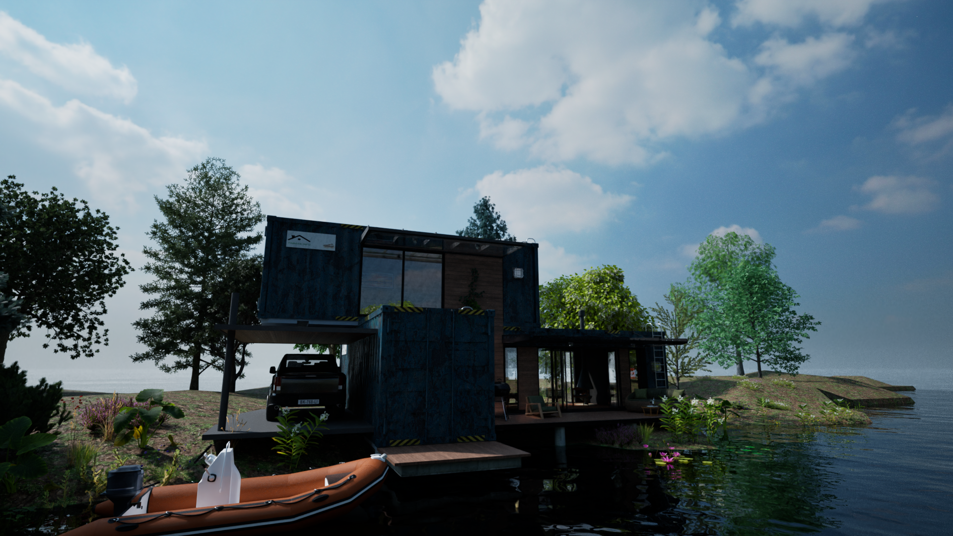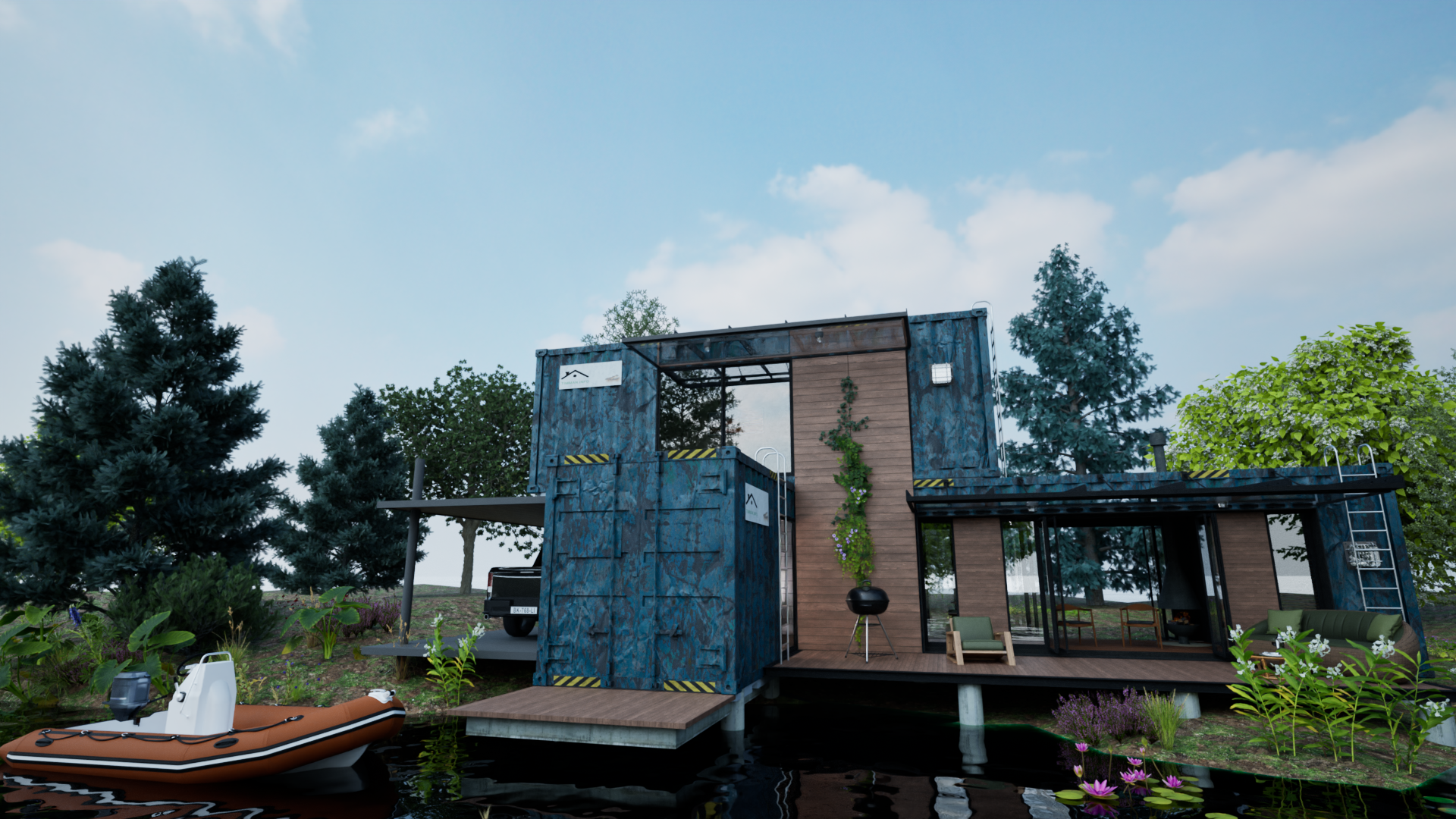 Twee containers zijn horizontaal naast elkaar geplaatst op de begane grond en vormen samen de hoofdstructuur van de woning. Hier bevinden zich de belangrijkste leefruimtes: een open woonkamer met uitzicht op het water, een volledig uitgeruste keuken, een eetgedeelte en een comfortabele slaapkamer. Dankzij het gebruik van grote glazen schuifdeuren en ramen ontstaat een naadloze overgang tussen binnen en buiten, waardoor natuurlijk licht overvloedig binnenvalt en bewoners voortdurend verbonden zijn met de omringende natuur.